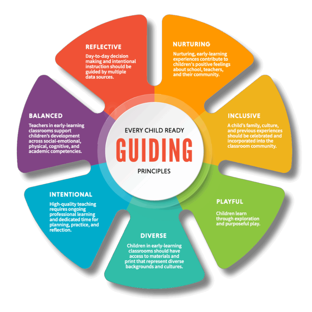 We believe that early childhood classrooms should be engaging, intentional, and playful. The Every Child Ready instructional model is rooted in seven guiding principles. These guiding principles establish a foundation for development, implementation, and decision-making that values the knowledge, needs, and experiences of children, families, teachers, and leaders.